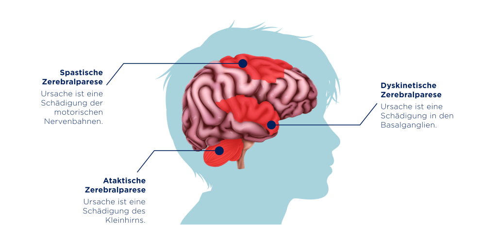 Je nachdem, welcher Bereich des Gehirns geschädigt ist, zeigen sich unterschiedliche Arten von Bewegungsstörungen. Entsprechend unterscheidet man in der Medizin im Wesentlichen zwischen spastischer, dyskinetischer und ataktischer Zerebralparese.²