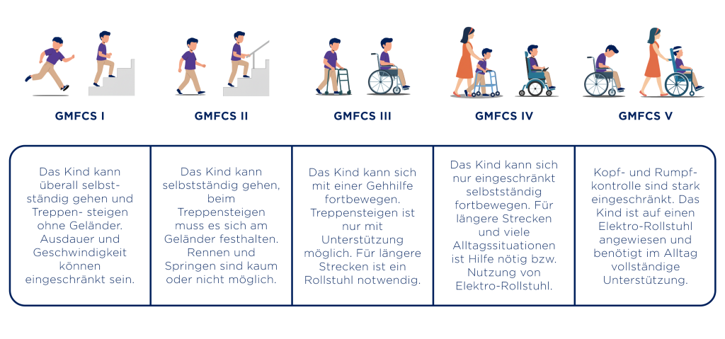 Das Gross Motor Function Classification System (GMFCS) beschreibt die grobmotorischen Fähigkeiten – also wie gut selbstständiges Sitzen, Stehen oder Gehen möglich ist. Für Kinder zwischen 6 und 12 Jahren sieht die Einteilung so aus:⁸