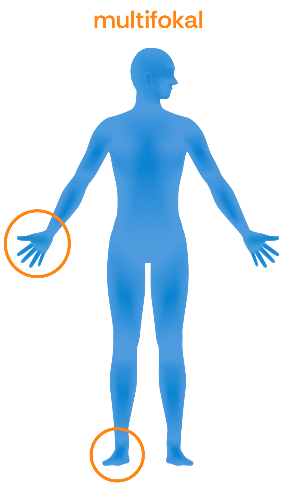 Multifokale Spastik: Mehrere voneinander getrennte Körperabschnitte sind betroffen, etwa eine Hand und ein Fuß.